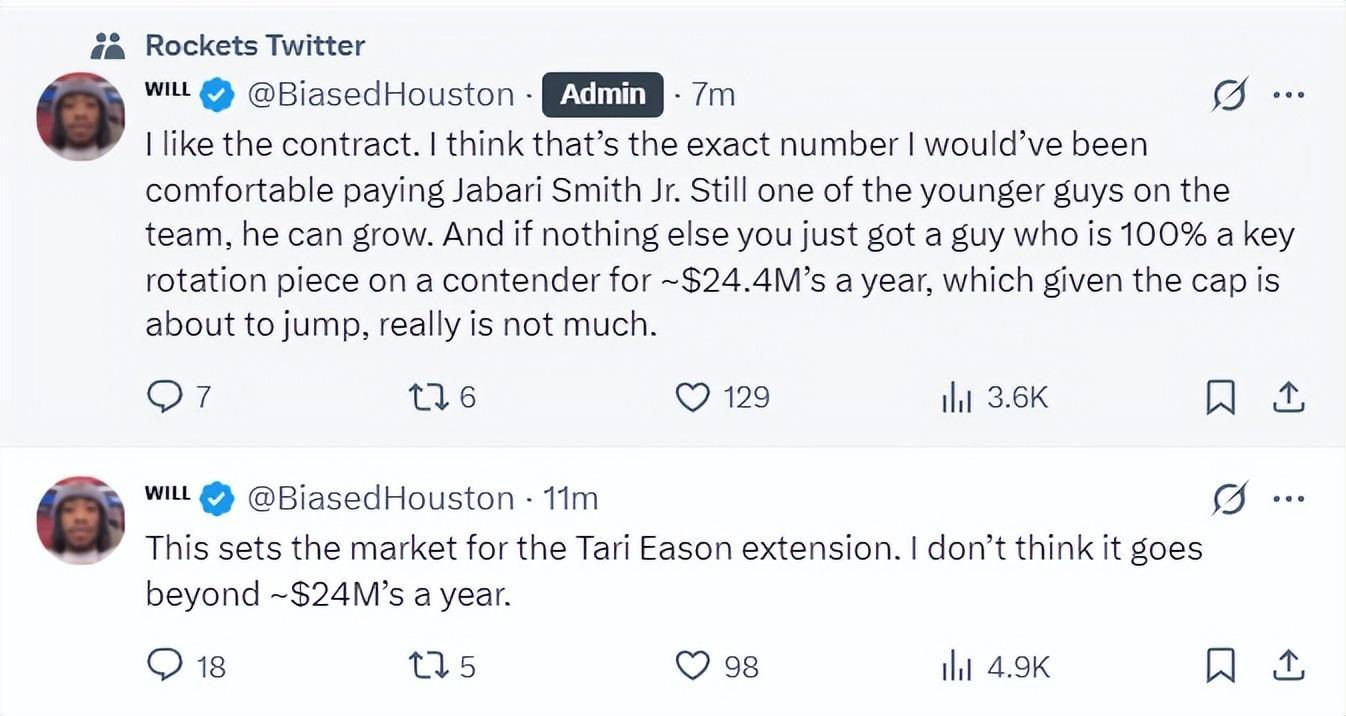 在小贾与火箭达成五年1.22亿的提前续约后,休媒Will就分析伊森与火箭的续约均薪不会超过2400万,因为小贾均薪是2440万,伊森会比小贾稍微低一些,很多火蜜认为五年1亿是最好的。
