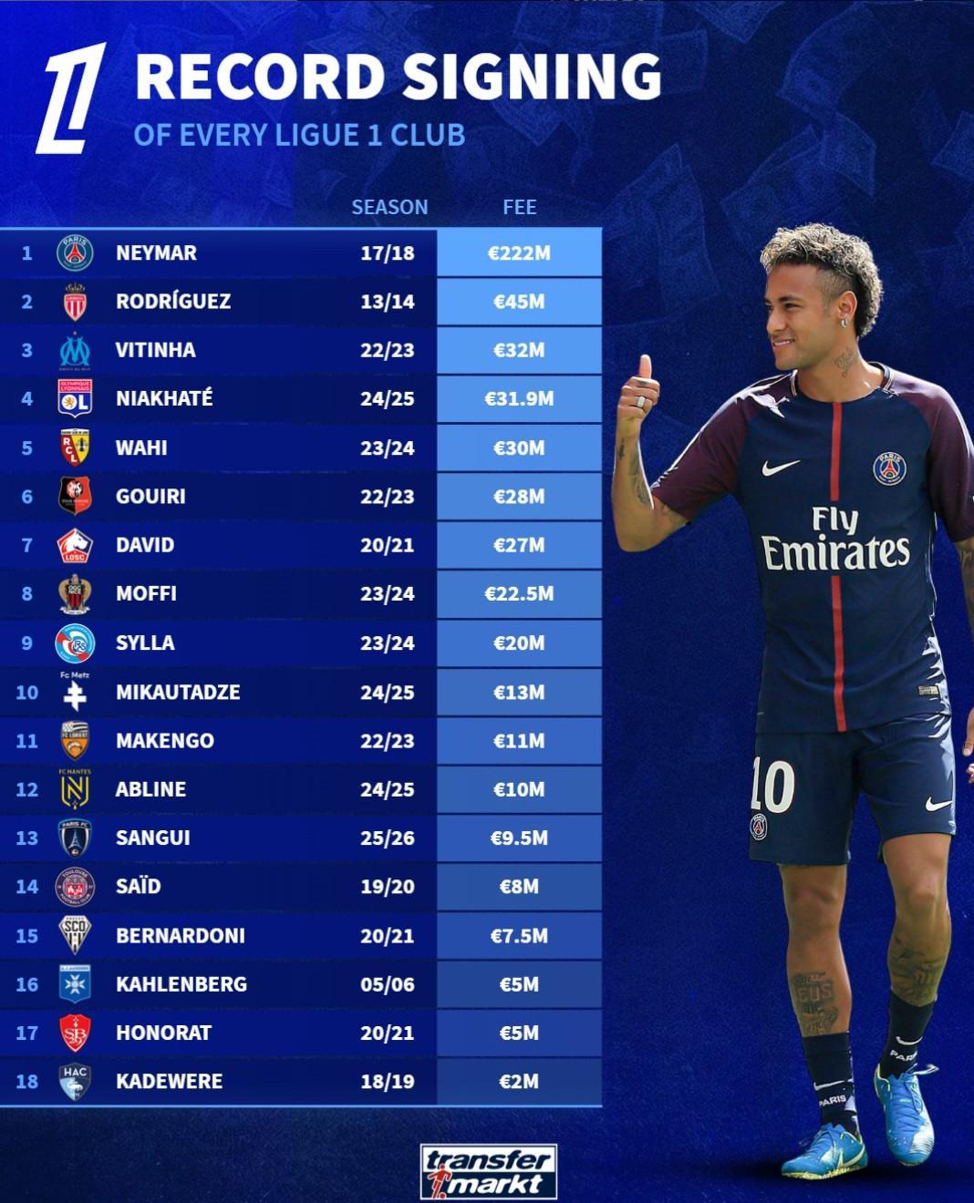 北京时间7月15日,德国转会市场网站列出了法甲18支球队队史引援转会费标王,其中内马尔2.2亿欧大幅度领先,J罗、乔纳森-戴维等人在列。